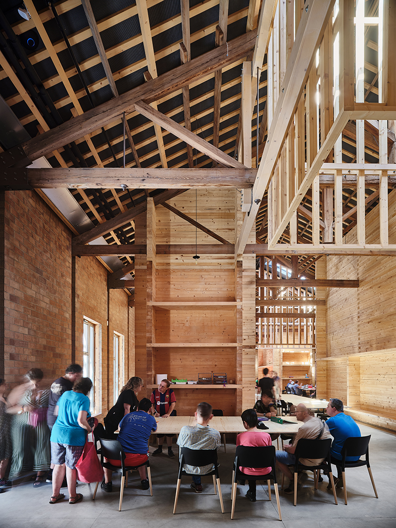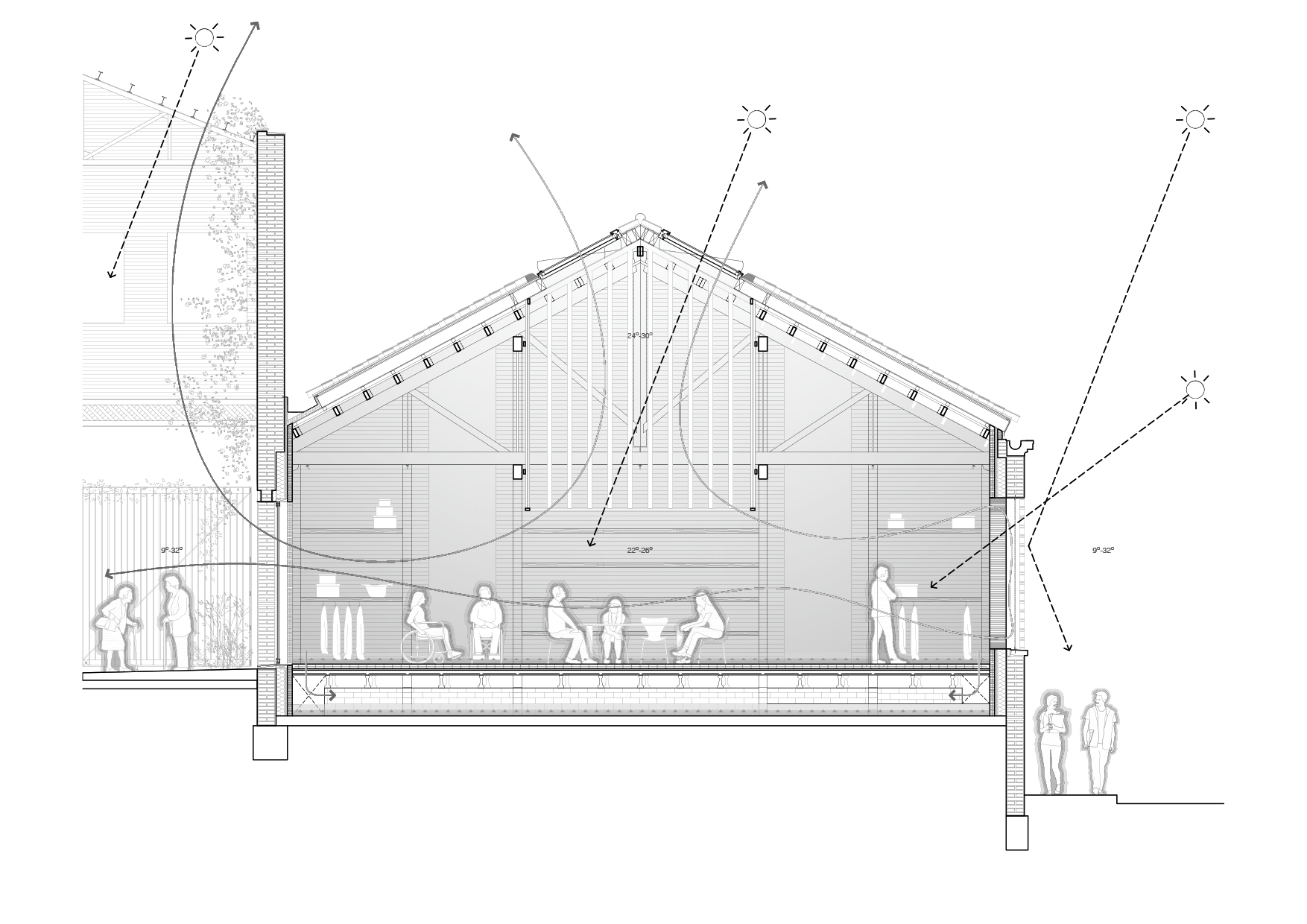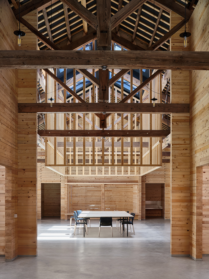 The project attempts to extend the wood-wood work that currently characterizes the original construction where the overlap between systems (tread-strap-sheet metal) creates a characteristic intricate texture of wooden slats of different dimensions. The new beams, the new closed boxes and the new skylights will follow the same nature of wood-wood overlap as if the same constructive system that configured the roof were extended to also solve the new needs of the building.
