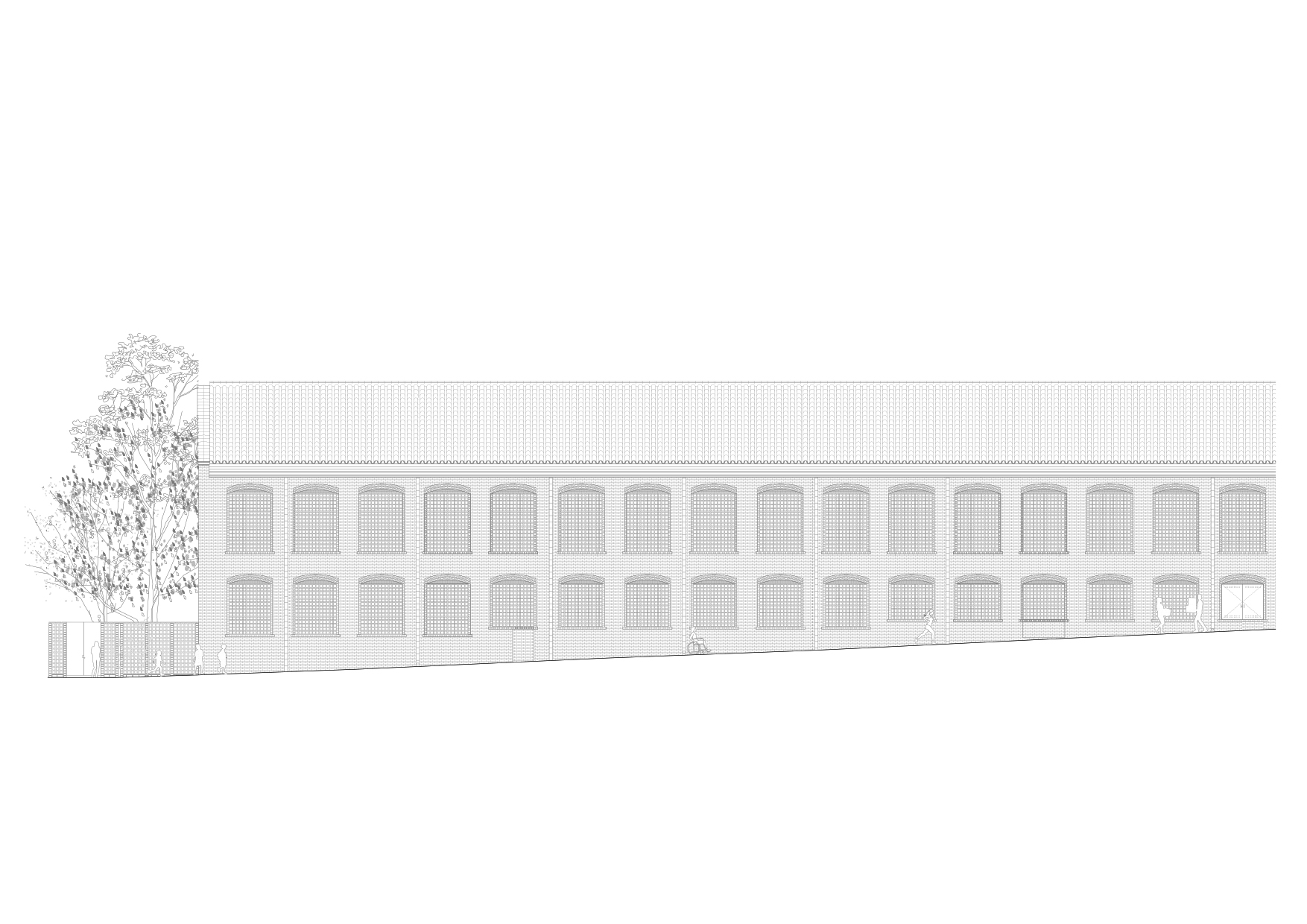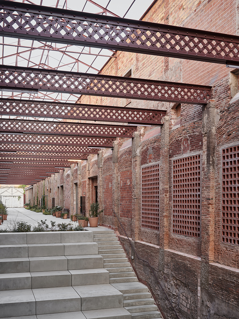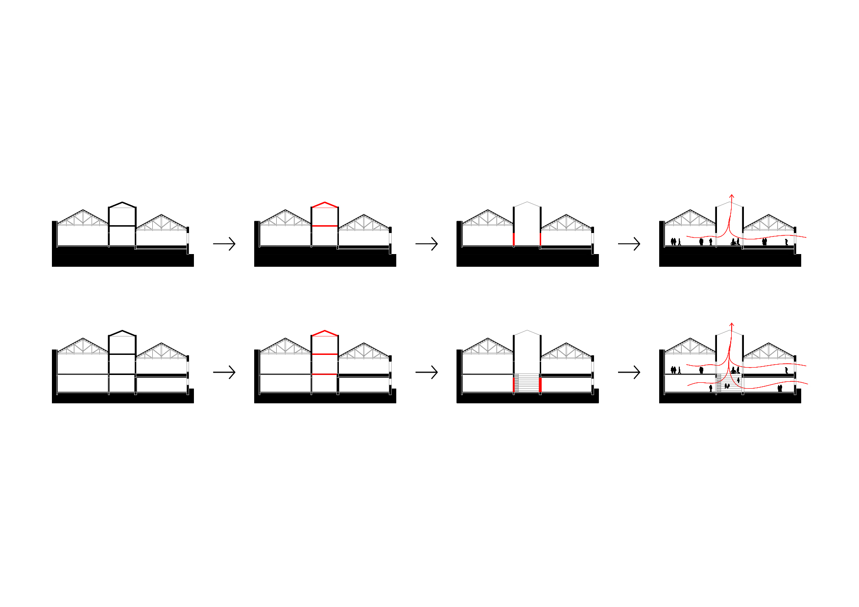 It is proposed to empty the floors and roof of the central body while maintaining the facades that give it its industrial character and the beams that stabilize them. Like a vestige completely emptied from the inside, where it rains and the air flows like any street but at the same time preserving all its history still present in its walls and transverse beams. A street that emerges from the selective demolition of the roofs but that continues to evoke what its recent history had been.
