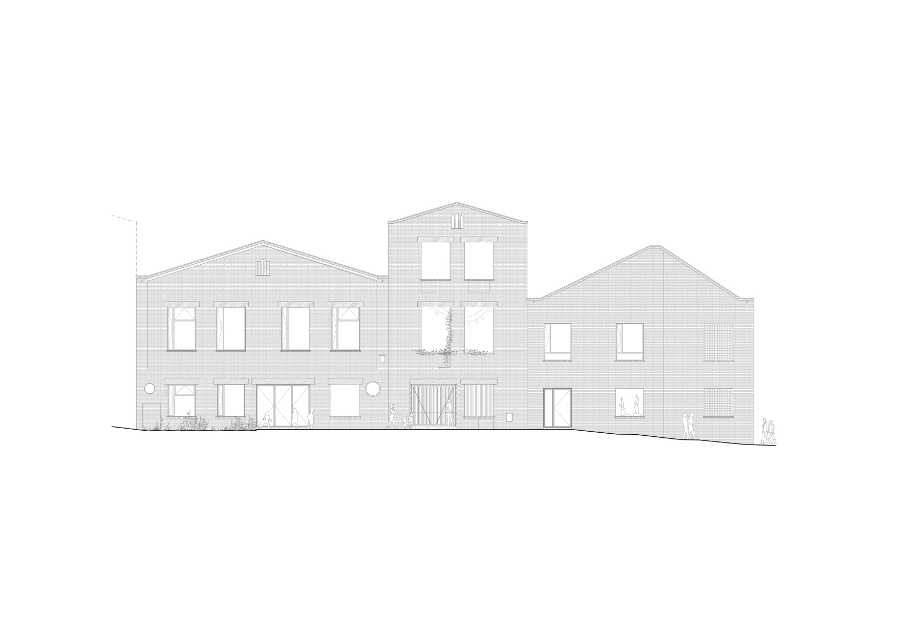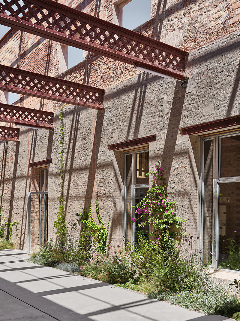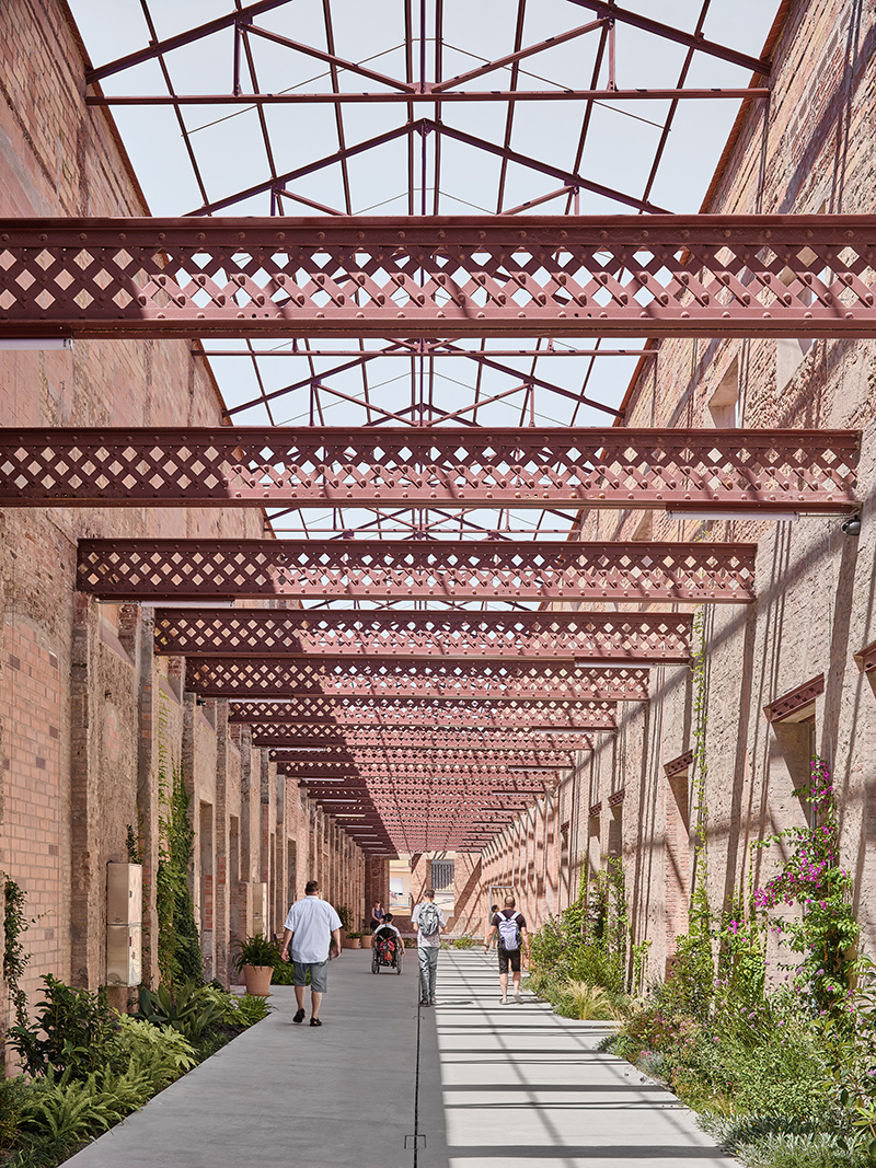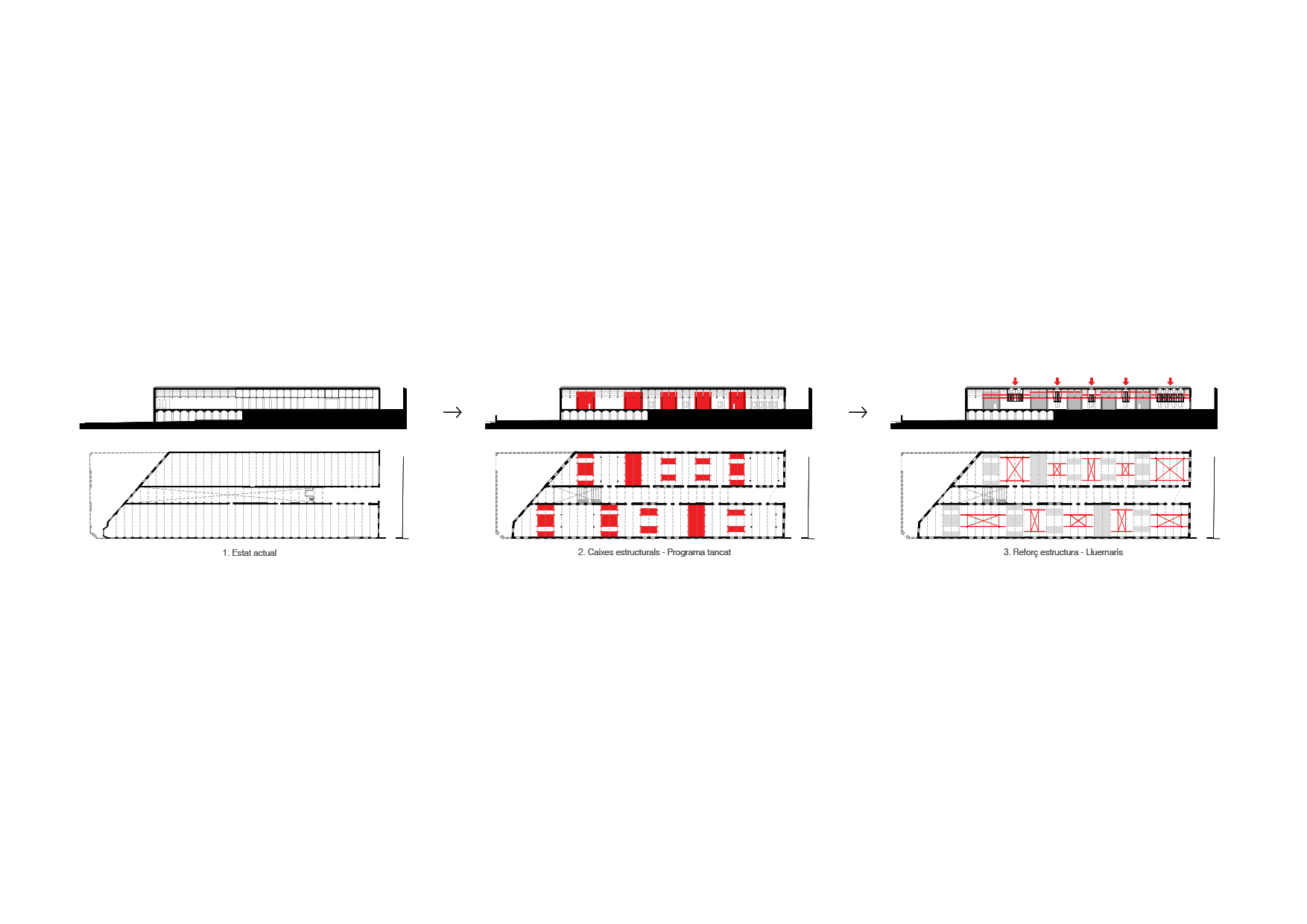 It is proposed to empty the floors and roof of the central body while maintaining the facades that give it its industrial character and the beams that stabilize them. Like a vestige completely emptied from the inside, where it rains and the air flows like any street but at the same time preserving all its history still present in its walls and transverse beams. A street that emerges from the selective demolition of the roofs but that continues to evoke what its recent history had been.