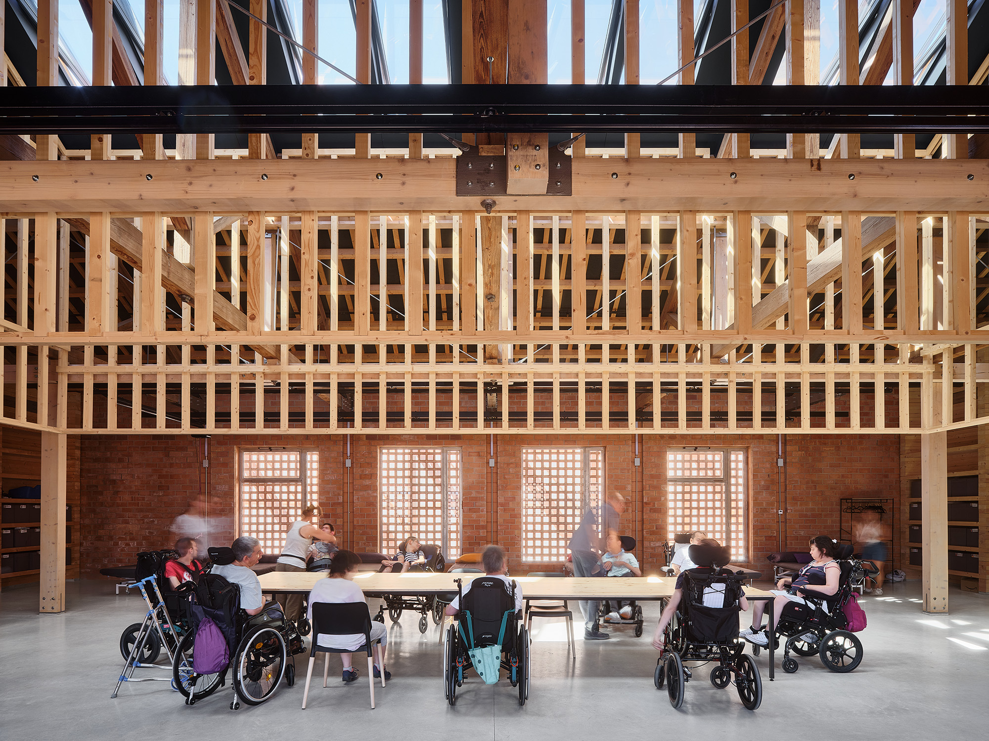 Along the two main (and original) naves, the different spaces of the centre are organized, accessed directly from the interior street but at the same time interconnected internally. These are activities that combine main uses such as; workshops, training classrooms, kitchen or dining rooms with more complementary spaces such as; bathrooms, meeting rooms or warehouses and that at the same time respond to different types of users according to the level of their disabilities.