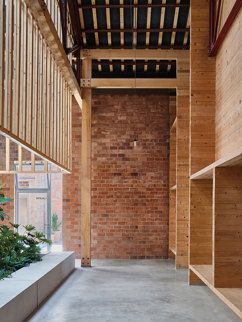 Beyond the new structural interventions with wood, the rest of the interventions try to be very discreet in order to preserve the original essence of the building and all its marks and transformations. To isolate the facades, an interior transposal has been chosen, finished with exposed ceramic wall panels that follow the rhythm of the facade.