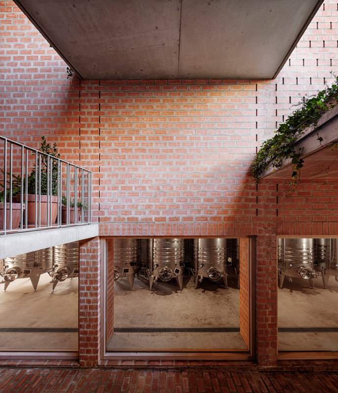 El interior de la nave es un gran espacio de triple altura donde se sitúan las tinas de fermentación del vino. Este es el espacio central del proyecto, el que realmente define la bodega y alrededor del cual se articulan todos los demás espacios. Un gran volumen de aire fresco rodeado de muros muy gruesos de hasta 1,75m de espesor que lo protegen. Un sistema de muros de carga cerámicos, con múltiples capas entre pilastras que crean cámaras para la circulación del aire -entre paredes- sirve para refrigerar el edificio. Dentro de estos grandes muros, también se configuran algunas estancias más pequeñas que sirven para alojar los usos complementarios de la actividad de la bodega.
