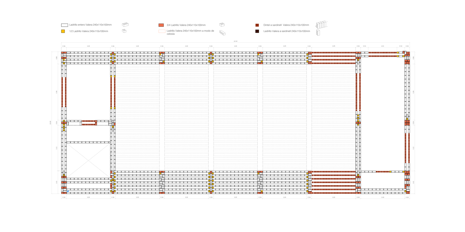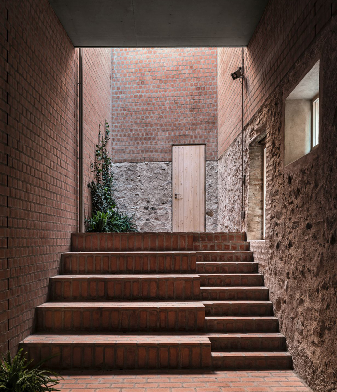 En el interior del solar, un muro de piedra de trazado irregular que había sido un antiguo frontón, y con una altura de unos 10 metros en los puntos más altos, hace de límite con los vecinos. Su geometría, la amalgama de piedras, recrecidos cerámicos y restos de enlucido, hacen de esta medianera un punto de partida para el proyecto.